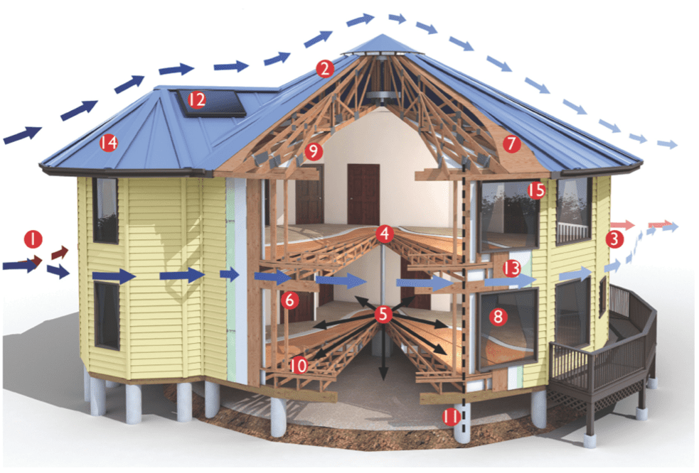 The company Deltec homes has engineered a hurricane-proof house construction that has withstood past very dissentious hurricanes including Katrina and Sandy [xv]. 1 of the reasons behind the success of these houses is their shape, a smart round shape. This aerodynamic blueprint, together with a reinforced roof allows the house to withstand winds upward to 185 mph [xvi].